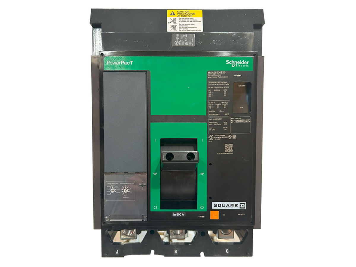 The PowerPact M Circuit Breaker (MGA36800E10) is a heavy-duty molded case circuit breaker designed for protection of electrical power distribution systems in industrial, commercial, and utility environments. It belongs to the PowerPact M series of breakers known for robust overload and short-circuit protection, adjustable trip settings, and compatibility with I-Line plug-in panelboards. Its adjustable trip unit allows setting the breaker to match system and load requirements, helping ensure reliable protection and system performance.